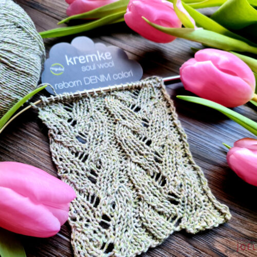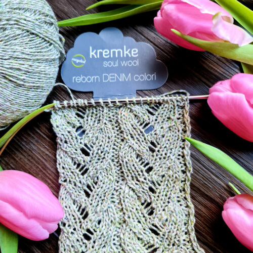 Vielleicht ist ja dann auch das heutige Montags-Muster etwas für euch – ein luftiges verzopftes Lochmuster. Gestrickt ist es aus einem Garn fast komplett aus recyceltem Denim und Baumwolle. Ein toller Beitrag zur Slow Fashion (mehr über das Garn findet ihr weiter unten in der Garnvorstellung).
