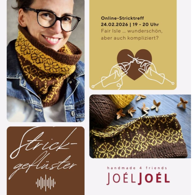 Kristin von Joél Joel lädt dich herzlich zu ihrem Online-Stricktreff ein und nimmt dich mit auf eine erste, entspannte Reise in die Welt des Fair-Isle-Strickens. Gemeinsam sprechen wir über passende Garne, harmonische Farbwahl, Kontraste und darüber, wie Muster wirklich zum Leben erwachen.
