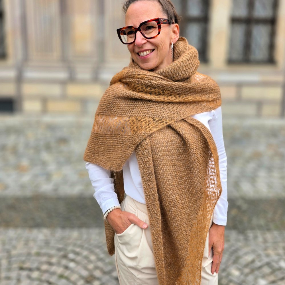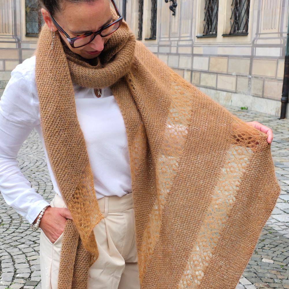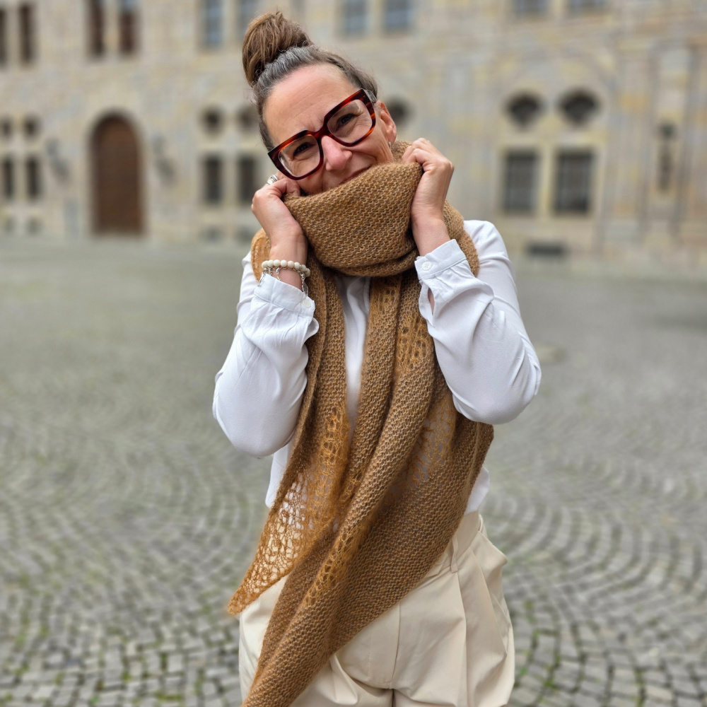 Das Design lebt von der harmonischen Kombination zweier Garne: Ein klassisches Lace-Garn trifft auf edles, flauschiges Mohair. Gemeinsam verstrickt entstehen in den kraus-rechten Partien weiche, dichte Strukturen, während das anschließende Lace-Muster nur mit Mohair gearbeitet wird und dem Schal Leichtigkeit, Transparenz und einen Hauch von Luxus verleiht. So entfaltet ELUA ein faszinierendes Spiel aus Textur, Garnqualität und Farbnuancen.