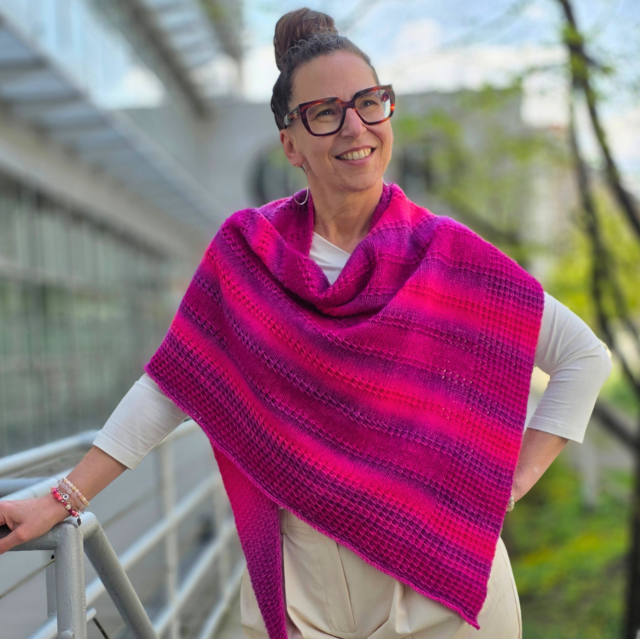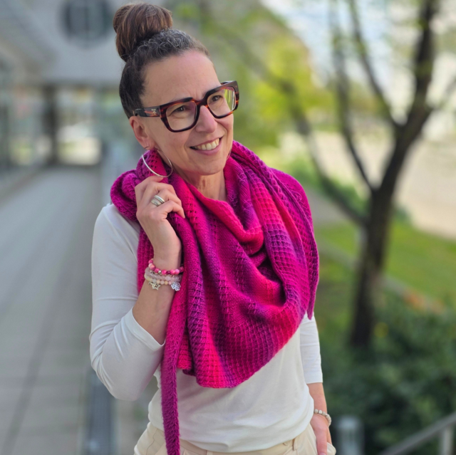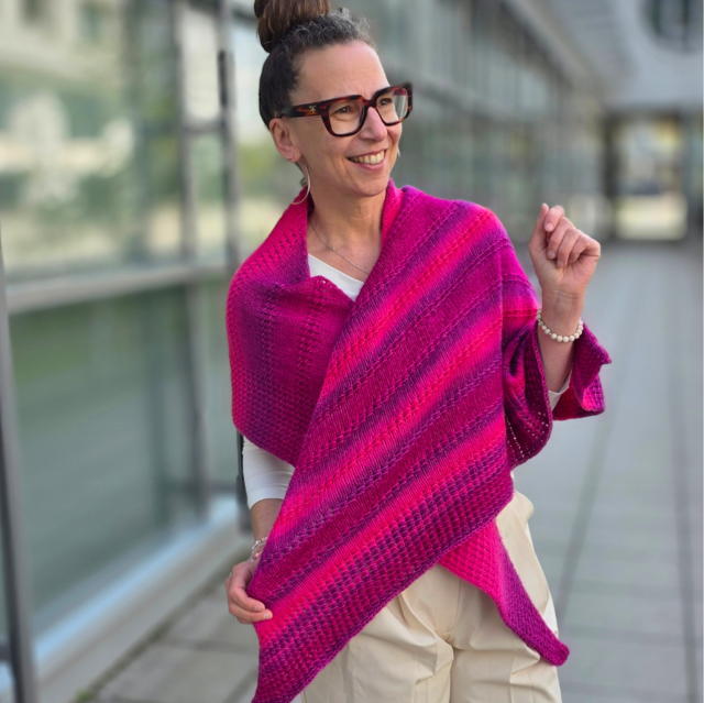 Entlang der geraden Kante verläuft ein einfaches, eingängiges Muster, das sich angenehm stricken lässt und schnell in einen ruhigen Rhythmus führt. In regelmäßigen Abständen wird dieses durch quer verlaufende Streifen unterbrochen und wieder aufgegriffen. So entsteht ein kleines Spiel aus Wiederholung und Variation, das dem Tuch Struktur und Lebendigkeit verleiht.